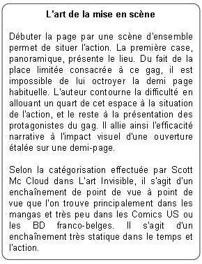 La juxtaposition de la lenteur des deux plans introductifs avec la rapidité des huit cases qui présentent l’action contribue, par sa brutalité, à accentuer le comique de la planche. Les cases dédiées à l’action sont de petite dimension. Le décor, omniprésent dans les deux grandes vignettes, est à présent occulté au profit des personnages. Des lignes de mouvement font leur apparition. La mise en scène cherche désormais à attirer l’oeil du spectateur sur l’action, contrairement aux plans larges de l’exposition, qui privilégiaient la mise en situation. La réduction de la taille des images, associée à une simplification du graphisme provoquée par l’évacuation des décors, produit un effet d’accélération. Au changement de rythme s’associe un changement de "prise de vue", puisqu’on passe de plans objectifs à des plans subjectifs, plus vivants et intenses. Ils s’avèrent mieux à même d’aspirer le spectateur dans la dynamique de l’histoire, quand le hiératisme de l’exposition maintenait une certaine distance.